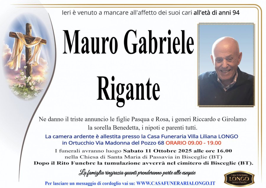 Ne danno il triste annuncio le figlie Pasqua e Rosa, i generi Riccardo e Girolamo, la sorella Benedetta, i nipoti e parenti tutti.