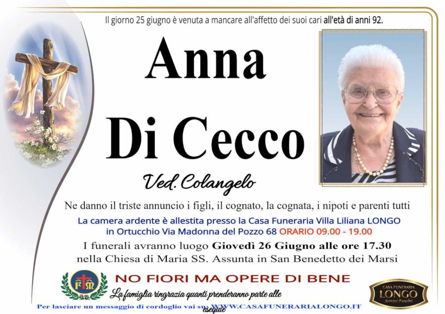 Ne danno il triste annuncio i figli, il cognato, la cognata, i nipoti e parenti tutti. La camera ardente è allestita presso la Casa Funeraria Villa Liliana LONGO in Ortucchio Via Madonna del Pozzo 68 ORARIO 09.00 - 19.00. I funerali avranno luogo Giovedì 26 Giugno alle ore 17.30 nella Chiesa di Maria SS. Assunta in San Benedetto dei Marsi. NO FIORI MA OPERE DI BENE. La famiglia ringrazia quanti prenderanno parte alle esequie. Per lasciare un messaggio di cordoglio vai su WWW.CASAFUNERARIALONGO.IT