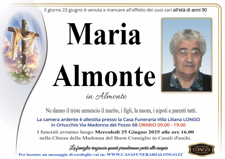 Il giorno 23 giugno è venuta a mancare all'affetto dei suoi cari all'età di anni 90nMarianAlmontenin AlmontenNe danno il triste annuncio il marito, i figli, la nuora, i nipoti e parenti tutti.nLa camera ardente è allestita presso la Casa Funeraria Villa Liliana LONGO in Ortucchio Via Madonna del Pozzo 68 ORARIO 09.00 - 19.00nI funerali avranno luogo Mercoledì 25 Giugno 2025 alle ore 16.00 nella Chiesa della Madonna del Buon Consiglio in Casali d'aschi.nLa famiglia ringrazia quanti prenderanno parte alle esequienPer lasciare un messaggio di cordoglio vai su: WWW.CASAFUNERARIALONGO.IT