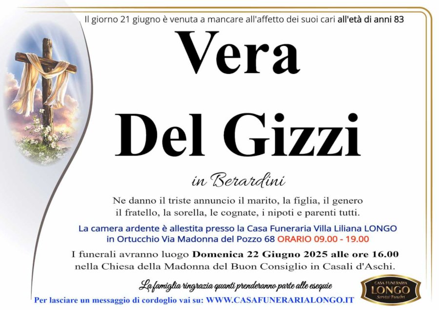 Il giorno 21 giugno è venuta a mancare all'affetto dei suoi cari all'età di anni 83 VeranDel Gizzinnin BerardininnNe danno il triste annuncio il marito, la figlia, il generonil fratello, la sorella, le cognate, i nipoti e parenti tutti. La camera ardente è allestita presso la Casa Funeraria Villa Liliana LONGOnin Ortucchio Via Madonna del Pozzo 68 ORARIO 09.00 - 19.00 I funerali avranno luogo Domenica 22 Giugno 2025 alle ore 16.00 ella Chiesa della Madonna del Buon Consiglio in Casali d'Aschi. La famiglia ringrazia quanti prenderanno parte alle esequiennPer lasciare un messaggio di cordoglio vai su: WWW.CASAFUNERARIALONGO.IT