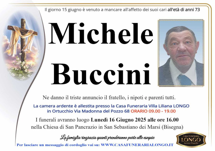 Ne danno il triste annuncio il fratello, i nipoti e parenti tutti.La camera ardente è allestita presso la Casa Funeraria Villa Liliana LONGO in Ortucchio Via Madonna del Pozzo 68 ORARIO 09.00 - 19.00 I funerali avranno luogo Lunedì 16 Giugno 2025 alle ore 16.00 nella Chiesa di San Pancrazio in San Sebastiano dei Marsi (Bisegna) La famiglia ringrazia quanti prenderanno parte alle esequie Per lasciare un messaggio di cordoglio vai su: WWW.CASAFUNERARIALONGO.IT CASA FUNERARIA LONGO Servizi Funebri
