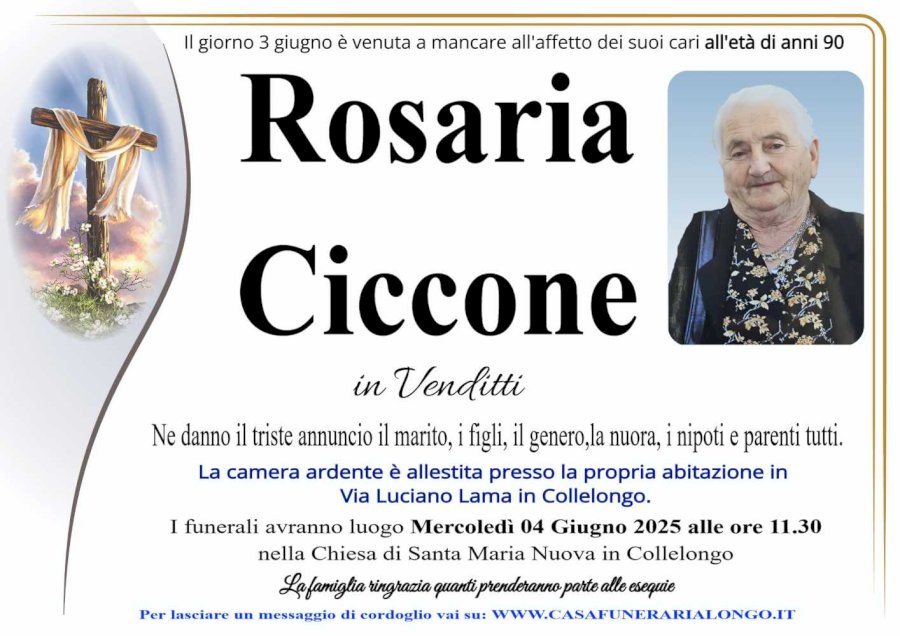 Il giorno 3 giugno è venuta a mancare all'affetto dei suoi cari all'età di anni 90 Rosaria Ciccone in Venditti. Ne danno il triste annuncio il marito, i figli, il genero, la nuora, i nipoti e parenti tutti. La camera ardente è allestita presso la propria abitazione in Via Luciano Lama in Collelongo. I funerali avranno luogo Mercoledì 04 Giugno 2025 alle ore 11.30 nella Chiesa di Santa Maria Nuova in Collelongo. La famiglia ringrazia quanti prenderanno parte alle esequie. Per lasciare un messaggio di cordoglio vai su: WWW.CASAFUNERARIALONGO.IT