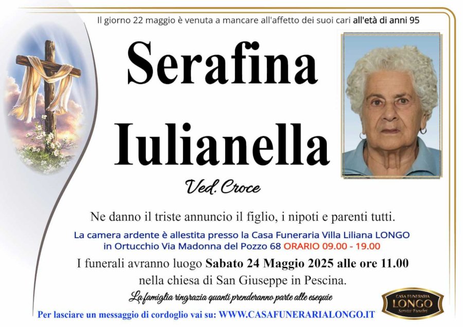 Il giorno 22 maggio è venuta a mancare all'affetto dei suoi cari all'età di anni 95 Serafina Iulianella Ved. Croce. Ne danno il triste annuncio il figlio, i nipoti e parenti tutti. La camera ardente è allestita presso la Casa Funeraria Villa Liliana LONGO in Ortucchio Via Madonna del Pozzo 68 ORARIO 09.00 - 19.00. I funerali avranno luogo Sabato 24 Maggio 2025 alle ore 11.00 nella chiesa di San Giuseppe in Pescina. La famiglia ringrazia quanti prenderanno parte alle esequie. Per lasciare un messaggio di cordoglio vai su: WWW.CASAFUNERARIALONGO.IT CASA FUNERARIA LONGO Servizi Funebri