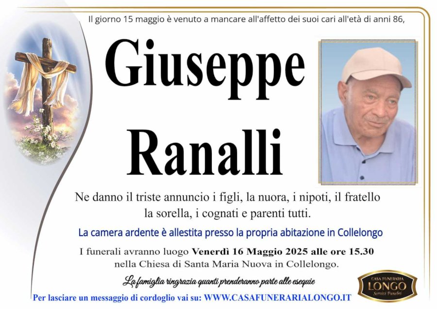 Il giorno 15 maggio è venuto a mancare all'affetto dei suoi cari all'età di anni 86, Giuseppe Ranalli Ne danno il triste annuncio i figli, la nuora, i nipoti, il fratello la sorella, i cognati e parenti tutti. La camera ardente è allestita presso la propria abitazione in Collelongo