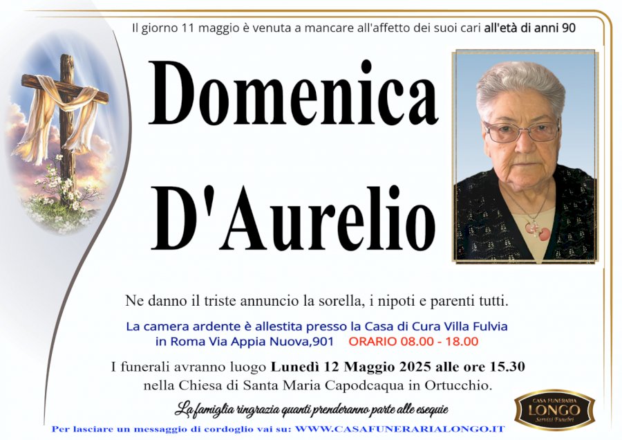 Il giorno 11 maggio è venuta a mancare all'affetto dei suoi cari all'età di anni 90 Domenica D'Aurelio. Ne danno il triste annuncio la sorella, i nipoti e parenti tutti. La camera ardente è allestita presso la Casa di Cura Villa Fulvia in Roma Via Appia Nuova,901 ORARIO 08.00 - 18.00. I funerali avranno luogo Lunedì 12 Maggio 2025 alle ore 15.30 nella Chiesa di Santa Maria Capodcaqua in Ortucchio. La famiglia ringrazia quanti prenderanno parte alle esequie