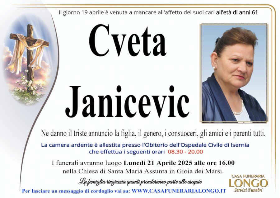 Il giorno 19 aprile è venuta a mancare all'affetto dei suoi cari all'età di anni 61 Cveta Janicevic. Ne danno il triste annuncio la figlia, il genero, i consuoceri, gli amici e i parenti tutti. La camera ardente è allestita presso l'Obitorio dell'Ospedale Civile di Isernia che effettua i seguenti orari 08.30 - 20.00. I funerali avranno luogo Lunedì 21 Aprile 2025 alle ore 16.00 nella Chiesa di Santa Maria Assunta in Gioia dei Marsi. La famiglia ringrazia quanti prenderanno parte alle esequie. Per lasciare un messaggio di cordoglio vai su: WWW.CASAFUNERARIALONGO.IT CASA FUNERARIA LONGO Servizi Funebri