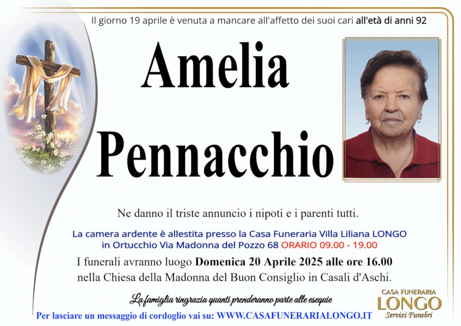 Il giorno 19 aprile è venuta a mancare all'affetto dei suoi cari all'età di anni 92 Amelia Pennacchio. Ne danno il triste annuncio i nipoti e i parenti tutti. La camera ardente è allestita presso la Casa Funeraria Villa Liliana LONGO in Ortucchio Via Madonna del Pozzo 68 ORARIO 09.00 - 19.00. I funerali avranno luogo Domenica 20 Aprile 2025 alle ore 16.00 nella Chiesa della Madonna del Buon Consiglio in Casali d'Aschi. La famiglia ringrazia quanti prenderanno parte alle esequie. Per lasciare un messaggio di cordoglio vai su: WWW.CASAFUNERARIALONGO.IT