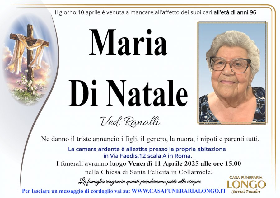 Il giorno 10 aprile è venuta a mancare all'affetto dei suoi cari all'età di anni 96 Maria Di Natale Ved. Ranalli Ne danno il triste annuncio i figli, il genero, la nuora, i nipoti e parenti tutti. La camera ardente è allestita presso la propria abitazione in Via Faedis,12 scala A in Roma. I funerali avranno luogo Venerdì 11 Aprile 2025 alle ore 15.00 nella Chiesa di Santa Felicita in Collarmele. La famiglia ringrazia quanti prenderanno parte alle esequie Per lasciare un messaggio di cordoglio vai su: WWW.CASAFUNERARIALONGO.IT CASA FUNERARIA LONGO Servizi Funebri