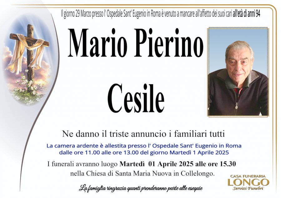 Il giorno 29 Marzo presso l'Ospedale Sant'Eugenio in Roma è venuto a mancare all'affetto dei suoi cari all'età di anni 94 Mario Pierino Cesile. Ne danno il triste annuncio i familiari tutti. La camera ardente è allestita presso l'Ospedale Sant'Eugenio in Roma dalle ore 11.00 alle ore 13.00 del giorno Martedì 1 Aprile 2025. I funerali avranno luogo Martedì 01 Aprile 2025 alle ore 15.30 nella Chiesa di Santa Maria Nuova in Collelongo. La famiglia ringrazia quanti prenderanno parte alle esequie.