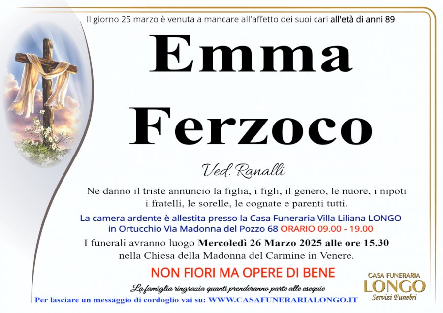 Ne danno il triste annuncio la figlia, i figli, il genero, le nuore, i nipoti i fratelli, le sorelle, le cognate e parenti tutti. La camera ardente è allestita presso la Casa Funeraria Villa Liliana LONGO in Ortucchio Via Madonna del Pozzo 68 ORARIO 09.00 - 19.00. I funerali avranno luogo Mercoledì 26 Marzo 2025 alle ore 15.30 nella Chiesa della Madonna del Carmine in Venere. NON FIORI MA OPERE DI BENE. La famiglia ringrazia quanti prenderanno parte alle esequie