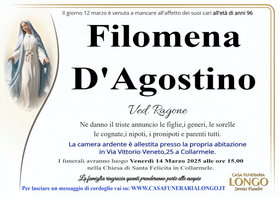 Il giorno 12 marzo è venuta a mancare all'affetto dei suoi cari all'età di anni 96 Filomena D'Agostino Ved. Ragone Ne danno il triste annuncio le figlie,i generi, le sorelle le cognate,i nipoti, i pronipoti e parenti tutti. La camera ardente è allestita presso la propria abitazione in Via Vittorio Veneto,25 a Collarmele. I funerali avranno luogo Venerdì 14 Marzo 2025 alle ore 15.00 nella Chiesa di Santa Felicità in Collarmele. La famiglia ringrazia quanti prenderanno parte alle esequie Per lasciare un messaggio di cordoglio vai su: WWW.CASAFUNERARIALONGO.IT