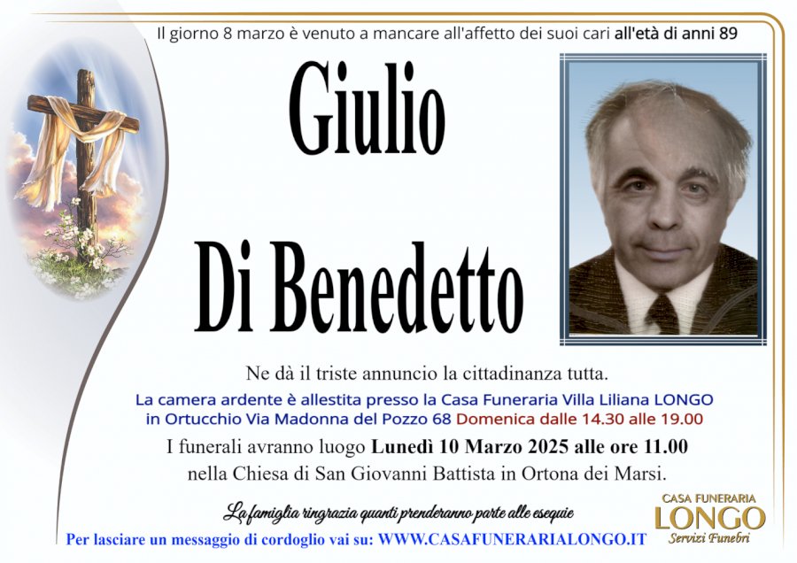 Il giorno 8 marzo è venuto a mancare all'affetto dei suoi cari all'età di anni 89 Giulio Di Benedetto Ne dà il triste annuncio la cittadinanza tutta. La camera ardente è allestita presso la Casa Funeraria Villa Liliana LONGO in Ortucchio Via Madonna del Pozzo 68 Domenica dalle 14.30 alle 19.00 I funerali avranno luogo Lunedì 10 Marzo 2025 alle ore 11.00 nella Chiesa di San Giovanni Battista in Ortona dei Marsi. La famiglia ringrazia quanti prenderanno parte alle esequie CASA FUNERARIA LONGO Servizi Funebri Per lasciare un messaggio di cordoglio vai su: WWW.CASAFUNERARIALONGO.IT