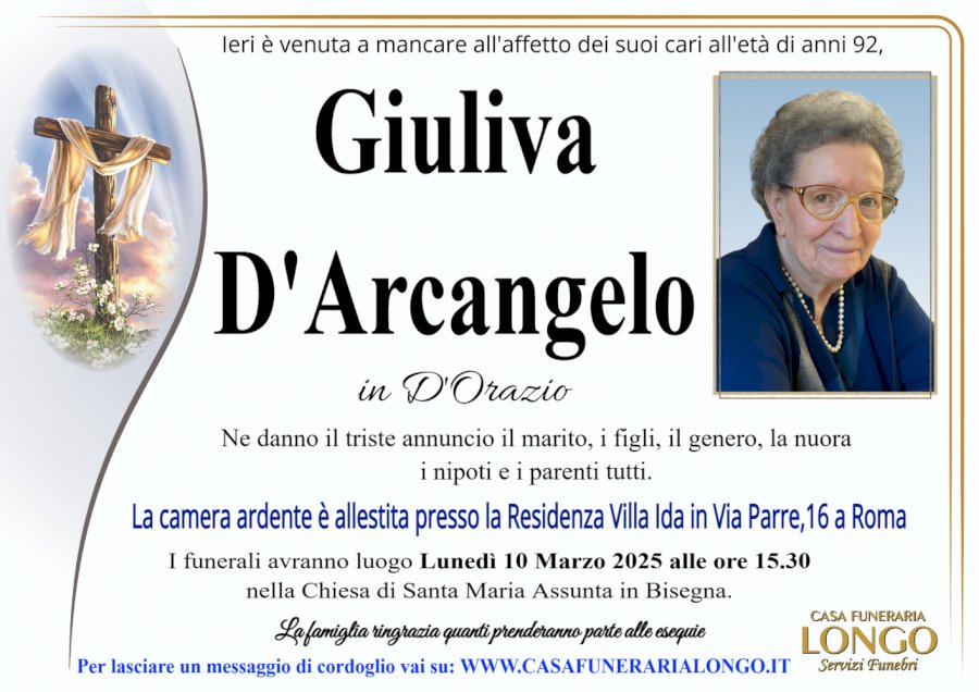 Ieri è venuta a mancare all'affetto dei suoi cari all'età di anni 92, Giuliva D'Arcangelo in D'Orazio. Ne danno il triste annuncio il marito, i figli, il genero, la nuora i nipoti e i parenti tutti. La camera ardente è allestita presso la Residenza Villa Ida in Via Parre,16 a Roma. I funerali avranno luogo Lunedì 10 Marzo 2025 alle ore 15.30 nella Chiesa di Santa Maria Assunta in Bisegna. La famiglia ringrazia quanti prenderanno parte alle esequie. Per lasciare un messaggio di cordoglio vai su: WWW.CASAFUNERARIALONGO.IT.