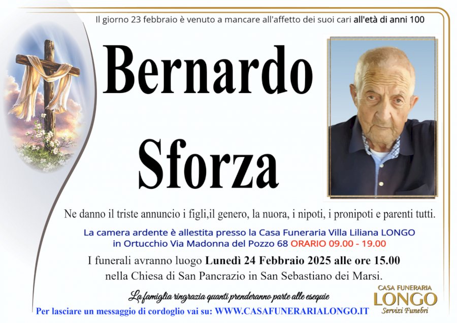 Il giorno 23 febbraio è venuto a mancare all'affetto dei suoi cari all'età di anni 100 Bernardo Sforza. Ne danno il triste annuncio i figli, il genero, la nuora, i nipoti, i pronipoti e parenti tutti. La camera ardente è allestita presso la Casa Funeraria Villa Liliana LONGO in Ortucchio Via Madonna del Pozzo 68 orario 09.00 - 19.00. I funerali avranno luogo Lunedì 24 Febbraio 2025 alle ore 15.00 nella Chiesa di San Pancrazio in San Sebastiano dei Marsi. La famiglia ringrazia quanti prenderanno parte alle esequie. Per lasciare un messaggio di cordoglio vai su: WWW.CASAFUNERARIALONGO.IT. CASA FUNERARIA LONGO Servizi Funebri.