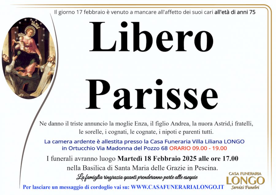 Il giorno 17 febbraio è venuto a mancare all'affetto dei suoi cari all'età di anni 75nLiberonParissenNe danno il triste annuncio la moglie Enza, il figlio Andrea, la nuora Astrid,i fratelli, le sorelle, i cognati, le cognate, i nipoti e parenti tutti.nLa camera ardente è allestita presso la Casa Funeraria Villa Liliana LONGO in Ortucchio Via Madonna del Pozzo 68 ORARIO 09.00 - 19.00nI funerali avranno luogo Martedì 18 Febbraio 2025 alle ore 17.00 ella Basilica di Santa Maria delle Grazie in Pescina.nLa famiglia ringrazia quanti prenderanno parte alle esequienPer lasciare un messaggio di cordoglio vai su: WWW.CASAFUNERARIALONGO.ITnCASA FUNERARIA LONGO Servizi Funebri