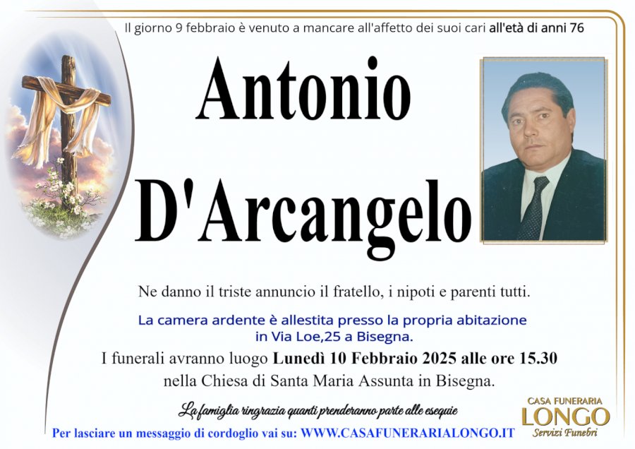 Il giorno 9 febbraio è venuto a mancare all'affetto dei suoi cari all'età di anni 76 Antonio D'Arcangelo. Ne danno il triste annuncio il fratello, i nipoti e parenti tutti. La camera ardente è allestita presso la propria abitazione in Via Loe,25 a Bisegna. I funerali avranno luogo Lunedì 10 Febbraio 2025 alle ore 15.30 nella Chiesa di Santa Maria Assunta in Bisegna. La famiglia ringrazia quanti prenderanno parte alle esequie Per lasciare un messaggio di cordoglio vai su: WWW.CASAFUNERARIALONGO.IT