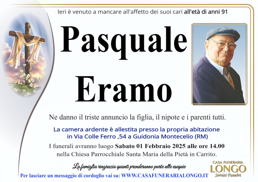 Ieri è venuto a mancare all'affetto dei suoi cari all'età di anni 91 Pasquale EramonnNe danno il triste annuncio la figlia, il nipote e i parenti tutti. La camera ardente è allestita presso la propria abitazione in Via Colle Ferro, 54 a Guidonia Montecelio (RM) I funerali avranno luogo Sabato 01 Febbraio 2025 alle ore 14.00 nella Chiesa Parrocchiale Santa Maria della Pietà in Carrito. La famiglia ringrazia quanti prenderanno parte alle esequiennPer lasciare un messaggio di cordoglio vai su: WWW.CASAFUNERARIALONGO.ITnnCASA FUNERARIA LONGO Servizi Funebri