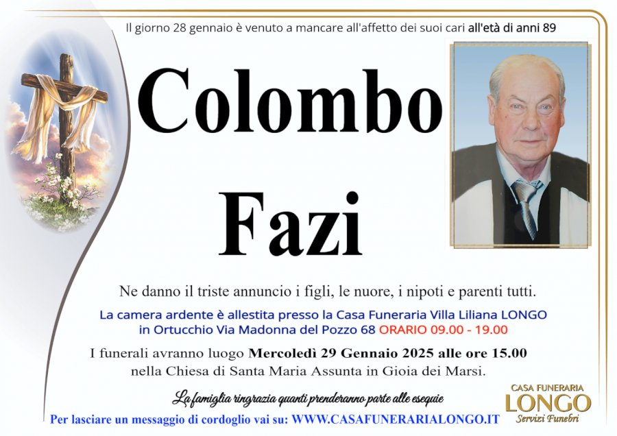 Il giorno 28 gennaio è venuto a mancare all'affetto dei suoi cari all'età di anni 89 Colombo Fazi. Ne danno il triste annuncio i figli, le nuore, i nipoti e parenti tutti. La camera ardente è allestita presso la Casa Funeraria Villa Liliana LONGO in Ortucchio Via Madonna del Pozzo 68 ORARIO 09.00 - 19.00. I funerali avranno luogo Mercoledì 29 Gennaio 2025 alle ore 15.00 nella Chiesa di Santa Maria Assunta in Gioia dei Marsi. La famiglia ringrazia quanti prenderanno parte alle eseque. Per lasciare un messaggio di cordoglio vai su: WWW.CASAFUNERARIALONGO.IT