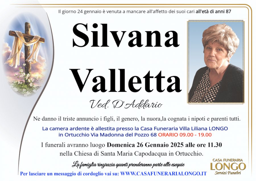 Ne danno il triste annuncio i figli, il genero, la nuora, la cognata i nipoti e parenti tutti. La camera ardente è allestita presso la Casa Funeraria Villa Liliana LONGO in Ortucchio Via Madonna del Pozzo 68 ORARIO 09.00 - 19.00 I funerali avranno luogo Domenica 26 Gennaio 2025 alle ore 11.30 nella Chiesa di Santa Maria Capodacqua in Ortucchio. La famiglia ringrazia quanti prenderanno parte alle esequie