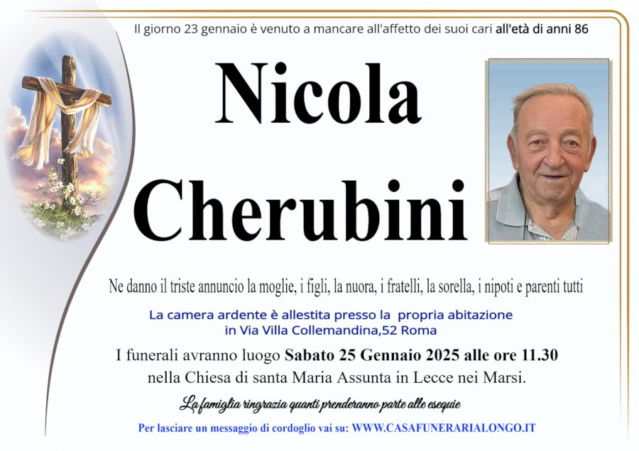 Il giorno 23 gennaio è venuto a mancare all'affetto dei suoi cari all'età di anni 86 Nicola Cherubini. Ne danno il triste annuncio la moglie, i figli, la nuora, i fratelli, la sorella, i nipoti e parenti tutti. La camera ardente è allestita presso la propria abitazione in Via Villa Collemandina,52 Roma. I funerali avranno luogo Sabato 25 Gennaio 2025 alle ore 11.30 nella Chiesa di santa Maria Assunta in Lecce nei Marsi. La famiglia ringrazia quanti prenderanno parte alle esequie. Per lasciare un messaggio di cordoglio vai su: WWW.CASAFUNERARIALONGO.IT