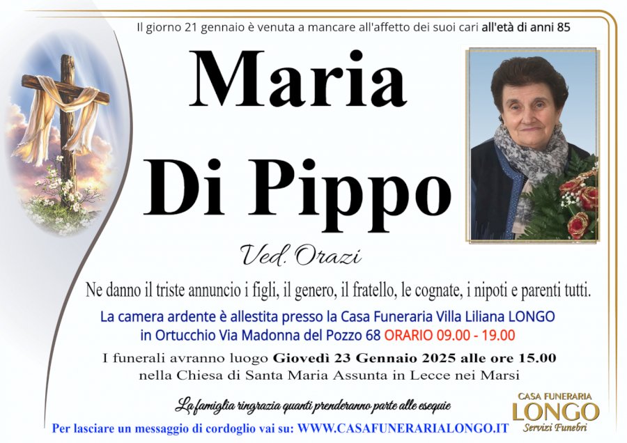 Il giorno 21 gennaio è venuta a mancare all'affetto dei suoi cari all'età di anni 85nMarianDi PipponVed. OrazinNe danno il triste annuncio i figli, il genero, il fratello, le cognate, i nipoti e parenti tutti.nLa camera ardente è allestita presso la Casa Funeraria Villa Liliana LONGO in Ortucchio Via Madonna del Pozzo 68 ORARIO 09.00 - 19.00nI funerali avranno luogo Giovedì 23 Gennaio 2025 alle ore 15.00 nella Chiesa di Santa Maria Assunta in Lecce nei MarsinLa famiglia ringrazia quanti prenderanno parte alle esequienCASA FUNERARIAnLONGOnServizi FunebrinPer lasciare un messaggio di cordoglio vai su: WWW.CASAFUNERARIALONGO.IT