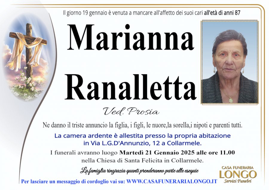 Il giorno 19 gennaio è venuta a mancare all'affetto dei suoi cari all'età di anni 87 Marianna Ranalletta Ved. Prosia. Ne danno il triste annuncio la figlia, i figli, le nuore, la sorella, i nipoti e parenti tutti. La camera ardente è allestita presso la propria abitazione in Via L.G.D'Annunzio, 12 a Collarmele. I funerali avranno luogo Martedì 21 Gennaio 2025 alle ore 11.00 nella Chiesa di Santa Felicita in Collarmele. Le famiglia ringrazia quanti prenderanno parte alle esequie.