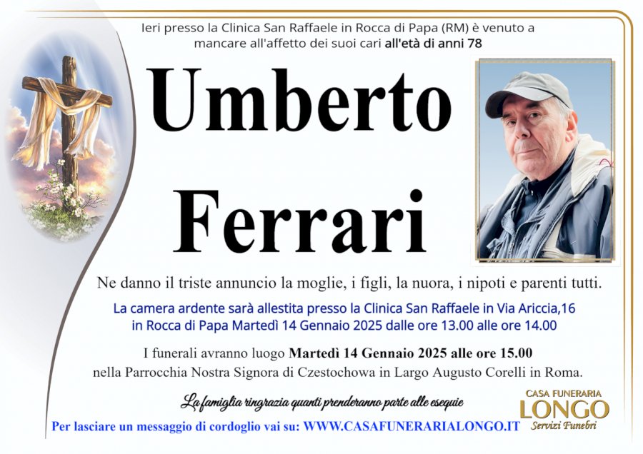 Ieri presso la Clinica San Raffaele in Rocca di Papa (RM) è venuto a mancare all'affetto dei suoi cari all'età di anni 78 Umberto Ferrari. Ne danno il triste annuncio la moglie, i figli, la nuora, i nipoti e parenti tutti. La camera ardente sarà allestita presso la Clinica San Raffaele in Via Ariccia,16 in Rocca di Papa Martedì 14 Gennaio 2025 dalle ore 13.00 alle ore 14.00. I funerali avranno luogo Martedì 14 Gennaio 2025 alle ore 15.00 nella Parrocchia Nostra Signora di Czestochowa in Largo Augusto Corelli in Roma. La famiglia ringrazia quanti prenderanno parte alle esequie. Per lasciare un messaggio di cordoglio vai su: WWW.CASAFUNERARIALONGO.IT CASA FUNERARIA LONGO Servizi Funebri