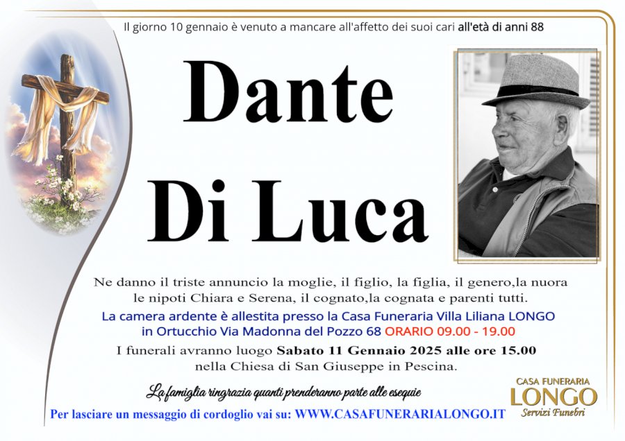 Il giorno 10 gennaio è venuto a mancare all'affetto dei suoi cari all'età di anni 88 Dante Di Luca. Ne danno il triste annuncio la moglie, il figlio, la figlia, il genero, la nuora le nipoti Chiara e Serena, il cognato, la cognata e parenti tutti. La camera ardente è allestita presso la Casa Funeraria Villa Liliana LONGO in Ortucchio Via Madonna del Pozzo 68 ORARIO 09.00 - 19.00. I funerali avranno luogo Sabato 11 Gennaio 2025 alle ore 15.00 nella Chiesa di San Giuseppe in Pescina. La famiglia ringrazia quanti prenderanno parte alle esequie. Per lasciare un messaggio di cordoglio vai su: WWW.CASAFUNERARIALONGO.IT CASA FUNERARIA LONGO Servizi Funebri.