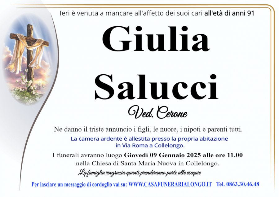 Ieri è venuta a mancare all'affetto dei suoi cari all'età di anni 91 Giulia Salucci Ved. Cerone. Ne danno il triste annuncio i figli, le nuore, i nipoti e parenti tutti. La camera ardente è allestita presso la propria abitazione in Via Roma a Collelongo. I funerali avranno luogo Giovedì 09 Gennaio 2025 alle ore 11.00 nella Chiesa di Santa Maria Nuova in Collelongo. La famiglia ringrazia quanti prenderanno parte alle esequie Per lasciare un messaggio di cordoglio vai su: WWW.CASAFUNERARIALONGO.IT Tel. 0863.30.46.48