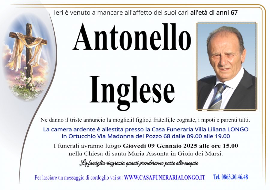 Ieri è venuto a mancare all'affetto dei suoi cari all'età di anni 67 AntonellonnInglesennNe danno il triste annuncio la moglie, il figlio, i fratelli, le cognate, i nipoti e parenti tutti. La camera ardente è allestita presso la Casa Funeraria Villa Liliana LONGO in Ortucchio Via Madonna del Pozzo 68 dalle 09.00 alle 19.00 I funerali avranno luogo Giovedì 09 Gennaio 2025 alle ore 15.00 nella Chiesa di santa Maria Assunta in Gioia dei Marsi. La famiglia ringrazia quanti prenderanno parte alle esequiennPer lasciare un messaggio di cordoglio vai su: WWW.CASAFUNERARIALONGO.IT Tel. 0863.30.46.48