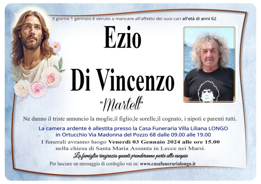Il giorno 1 gennaio è venuto a mancare all'affetto dei suoi cari all'età di anni 62 EzionDi Vincenzon"Martell" Ne danno il triste annuncio la moglie, il figlio, le sorelle, il cognato, i nipoti e parenti tutti. La camera ardente è allestita presso la Casa Funeraria Villa Liliana LONGO in Ortucchio Via Madonna del Pozzo 68 dalle 09.00 alle 19.00 I funerali avranno luogo Venerdì 03 Gennaio 2024 alle ore 15.00 nella chiesa di Santa Maria Assunta in Lecce nei Marsi. Le famiglia ringrazia quanti prenderanno parte alle esequiennPer lasciare un messaggio di cordoglio vai su: www.casafunerarialongo.it