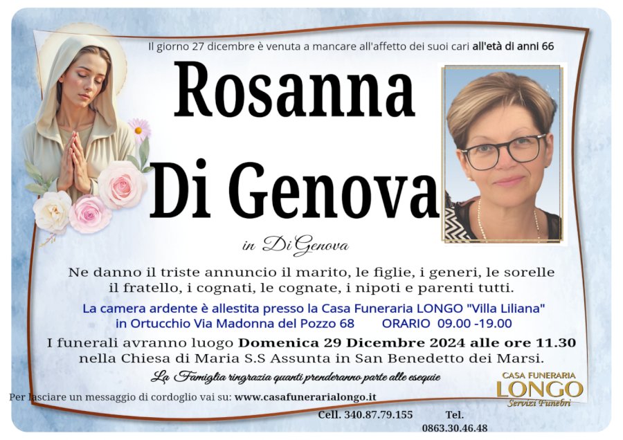 Il giorno 27 dicembre è venuta a mancare all'affetto dei suoi cari all'età di anni 66 RosannannDi Genovannin Di GenovannNe danno il triste annuncio il marito, le figlie, i generi, le sorellenil fratello, i cognati, le cognate, i nipoti e parenti tutti. La camera ardente è allestita presso la Casa Funeraria LONGO "Villa Liliana"nin Ortucchio Via Madonna del Pozzo 68 ORARIO 09.00 -19.00 I funerali avranno luogo Domenica 29 Dicembre 2024 alle ore 11.30 ella Chiesa di Maria S.S Assunta in San Benedetto dei Marsi. La Famiglia ringrazia quanti prenderanno parte alle esequiennPer lasciare un messaggio di cordoglio vai su: www.casafunerarialongo.itnnCASA FUNERARIAnLONGOnServizi FunebrinnCell. 340.87.79.155 Tel.n 0863.30.46.48