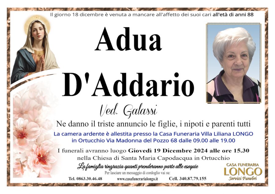 Il giorno 18 dicembre è venuta a mancare all'affetto dei suoi cari all'età di anni 88 AduanD'AddarionVed. GalassinnNe danno il triste annuncio le figlie, i nipoti e parenti tuttinnLa camera ardente è allestita presso la Casa Funeraria Villa Liliana LONGOnin Ortucchio Via Madonna del Pozzo 68 dalle 09.00 alle 19.00 I funerali avranno luogo Giovedì 19 Dicembre 2024 alle ore 15.30 ella Chiesa di Santa Maria Capodacqua in OrtucchionnLa famiglia ringrazia quanti prenderanno parte alle esequiennPer lasciare un messaggio di cordoglio vai su:nTel. 0863.30.46.48 www.casafunerarialongo.it Cell. 340.87.79.155 CASA FUNERARIAnLONGOnServizi Funebri