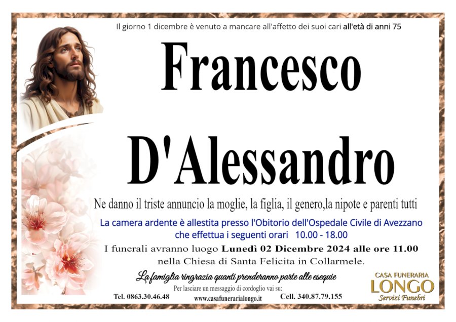 Ne danno il triste annuncio la moglie, la figlia, il genero, la nipote e parenti tutti. La camera ardente è allestita presso l'Obitorio dell'Ospedale Civile di Avezzano che effettua i seguenti orari 10.00 - 18.00. I funerali avranno luogo Lunedì 02 Dicembre 2024 alle ore 11.00 nella Chiesa di Santa Felicita in Collarmele. La famiglia ringrazia quanti prenderanno parte alle esequie.