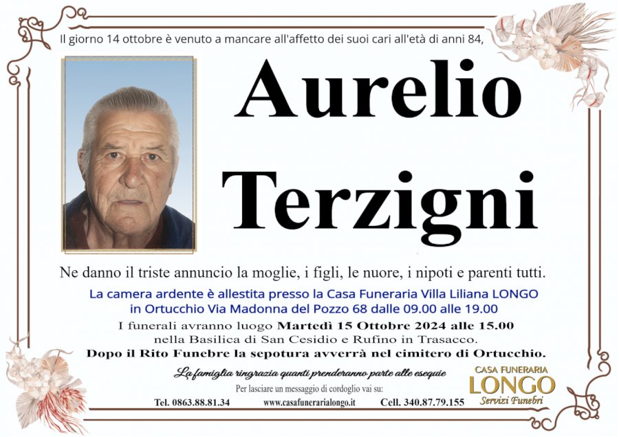 Il giorno 14 ottobre è venuto a mancare all'affetto dei suoi cari all'età di anni 84, Aurelio Terzigni. Ne danno il triste annuncio la moglie, i figli, le nuore, i nipoti e parenti tutti. La camera ardente è allestita presso la Casa Funeraria Villa Liliana LONGO in Ortucchio Via Madonna del Pozzo 68 dalle 09.00 alle 19.00. I funerali avranno luogo Martedì 15 Ottobre 2024 alle 15.00 nella Basilica di San Cesidio e Rufino in Trasacco. Dopo il Rito Funebre la sepotura avverrà nel cimitero di Ortucchio. La famiglia ringrazia quanti prenderanno parte alle esequie.