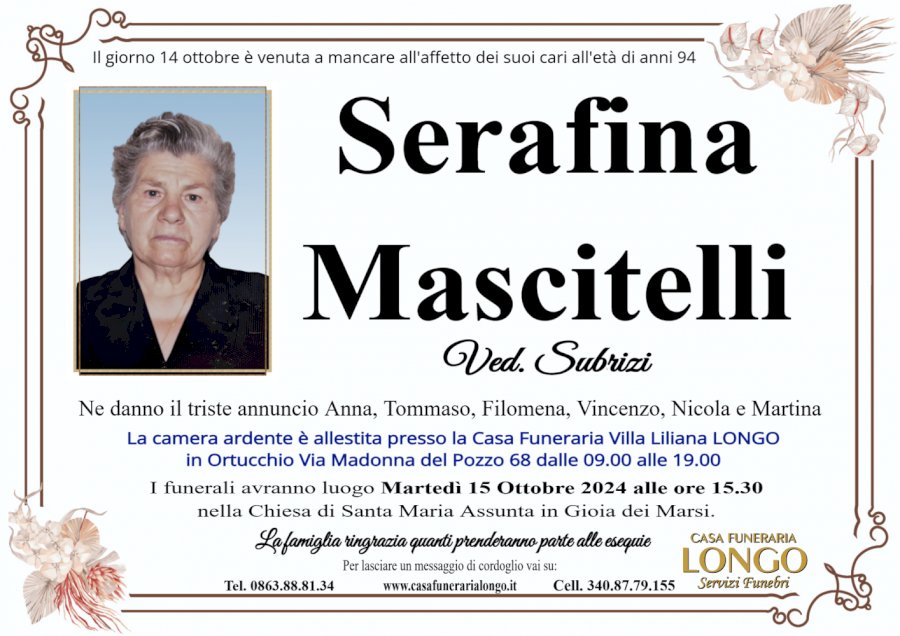 Il giorno 14 ottobre è venuta a mancare all'affetto dei suoi cari all'età di anni 94. Ne danno il triste annuncio Anna, Tommaso, Filomena, Vincenzo, Nicola e Martina. La camera ardente è allestita presso la Casa Funeraria Villa Liliana LONGO in Ortucchio Via Madonna del Pozzo 68 dalle 09.00 alle 19.00. I funerali avranno luogo Martedì 15 Ottobre 2024 alle ore 15.30 nella Chiesa di Santa Maria Assunta in Gioia dei Marsi. La famiglia ringrazia quanti prenderanno parte alle esequie.