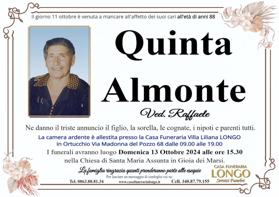Il giorno 11 ottobre è venuta a mancare all'affetto dei suoi cari all'età di anni 88 Quinta Almonte Ved. Raffaele. Ne danno il triste annuncio il figlio, la sorella, le cognate, i nipoti e parenti tutti. La camera ardente è allestita presso la Casa Funeraria Villa Liliana LONGO in Ortucchio Via Madonna del Pozzo 68 dalle 09.00 alle 19.00. I funerali avranno luogo Domenica 13 Ottobre 2024 alle ore 15.30 nella Chiesa di Santa Maria Assunta in Gioia dei Marsi. La famiglia ringrazia quanti prenderanno parte alle esequie.
