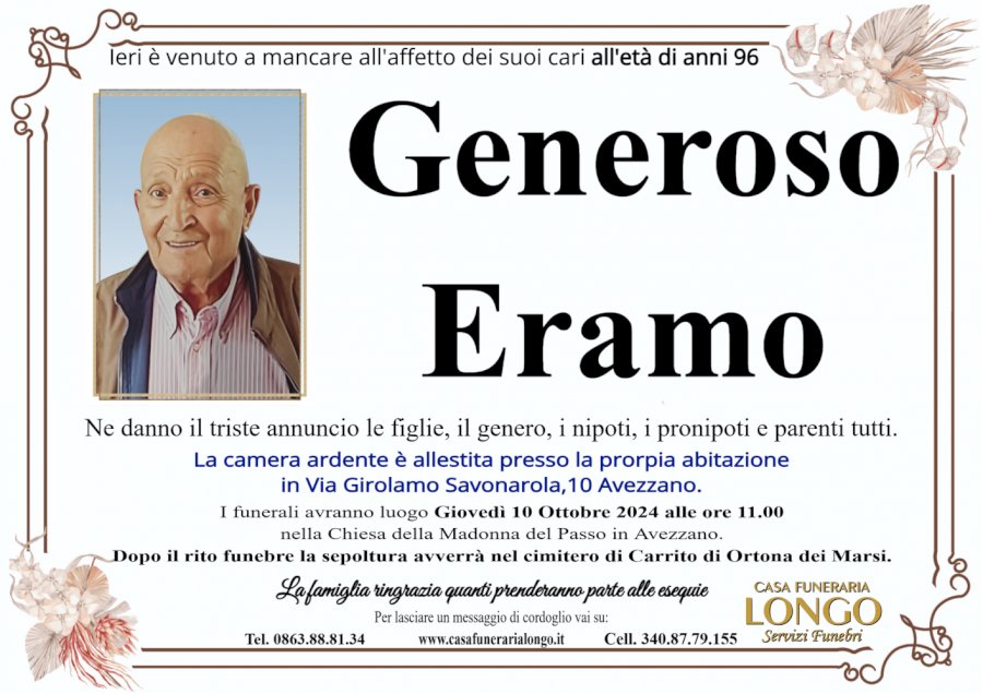 Ieri è venuto a mancare all'affetto dei suoi cari all'età di anni 96 Generoso Eramo. Ne danno il triste annuncio le figlie, il genero, i nipoti, i pronipoti e parenti tutti. La camera ardente è allestita presso la prorpia abitazione in Via Girolamo Savonarola,10 Avezzano. I funerali avranno luogo Giovedì 10 Ottobre 2024 alle ore 11.00 nella Chiesa della Madonna del Passo in Avezzano. Dopo il rito funebre la sepoltura avverrà nel cimitero di Carrito di Ortona dei Marsi. La famiglia ringrazia quanti prenderanno parte alle esequie. Per lasciare un messaggio di cordoglio vai su: Tel. 0863.88.81.34 www.casafunerarialongo.it Cell. 340.87.79.155 CASA FUNERARIA LONGO Servizi Funebri
