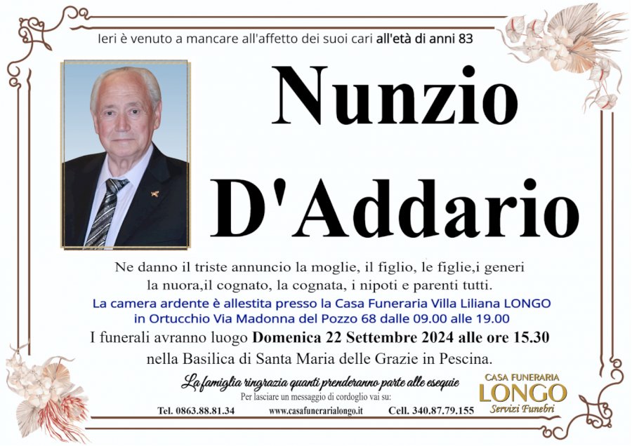 Ieri è venuto a mancare all'affetto dei suoi cari all'età di anni 83nNunzio D'AddarionNe danno il triste annuncio la moglie, il figlio, le figlie,i generi la nuora,il cognato, la cognata, i nipoti e parenti tutti.nLa camera ardente è allestita presso la Casa Funeraria Villa Liliana LONGO in Ortucchio Via Madonna del Pozzo 68 dalle 09.00 alle 19.00nI funerali avranno luogo Domenica 22 Settembre 2024 alle ore 15.30 nella Basilica di Santa Maria delle Grazie in Pescina.nLa famiglia ringrazia quanti prenderanno parte alle esequienPer lasciare un messaggio di cordoglio vai su:nTel. 0863.88.81.34 www.casafunerarialongo.it Cell. 340.87.79.155nCASA FUNERARIA LONGO Servizi Funebri