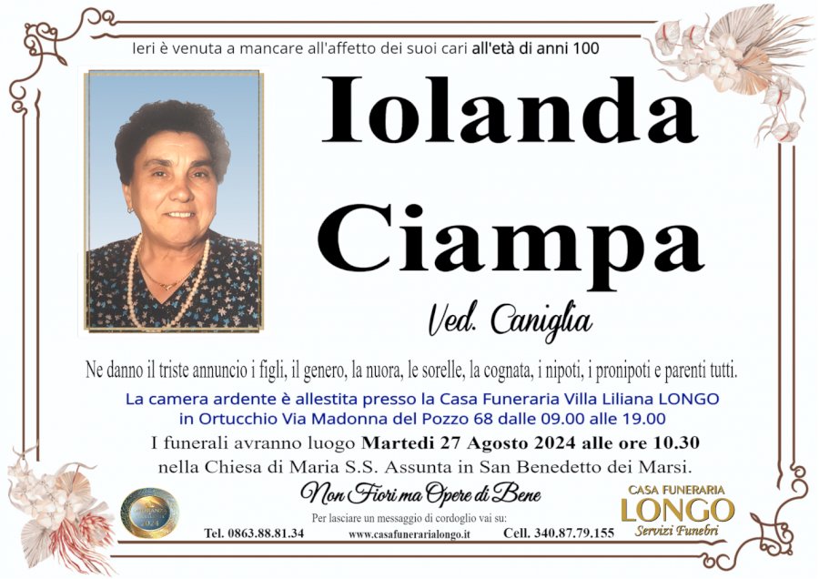 Ieri è venuta a mancare all'affetto dei suoi cari all'età di anni 100 Iolanda Ciampa Ved. Caniglia Ne danno il triste annuncio i figli, il genero, la nuora, le sorelle, la cognata, i nipoti, i pronipoti e parenti tutti.
