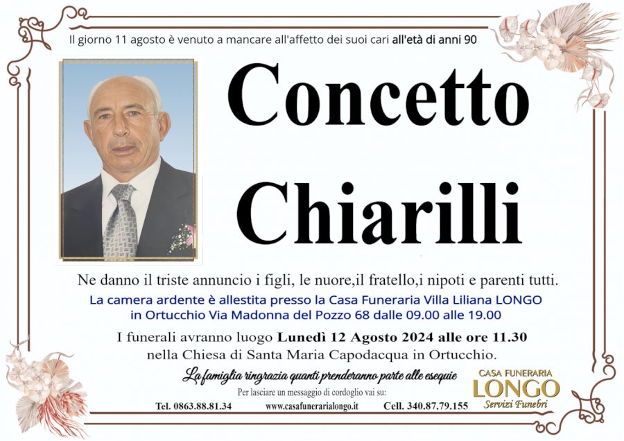 Il giorno 11 agosto è venuto a mancare all'affetto dei suoi cari all'età di anni 90 Concetto Chiarilli. Ne danno il triste annuncio i figli, le nuore, il fratello, i nipoti e parenti tutti. La camera ardente è allestita presso la Casa Funeraria Villa Liliana LONGO in Ortucchio Via Madonna del Pozzo 68 dalle 09.00 alle 19.00. I funerali avranno luogo Lunedì 12 Agosto 2024 alle ore 11.30 nella Chiesa di Santa Maria Capodacqua in Ortucchio. La famiglia ringrazia quanti prenderanno parte alle esequie.