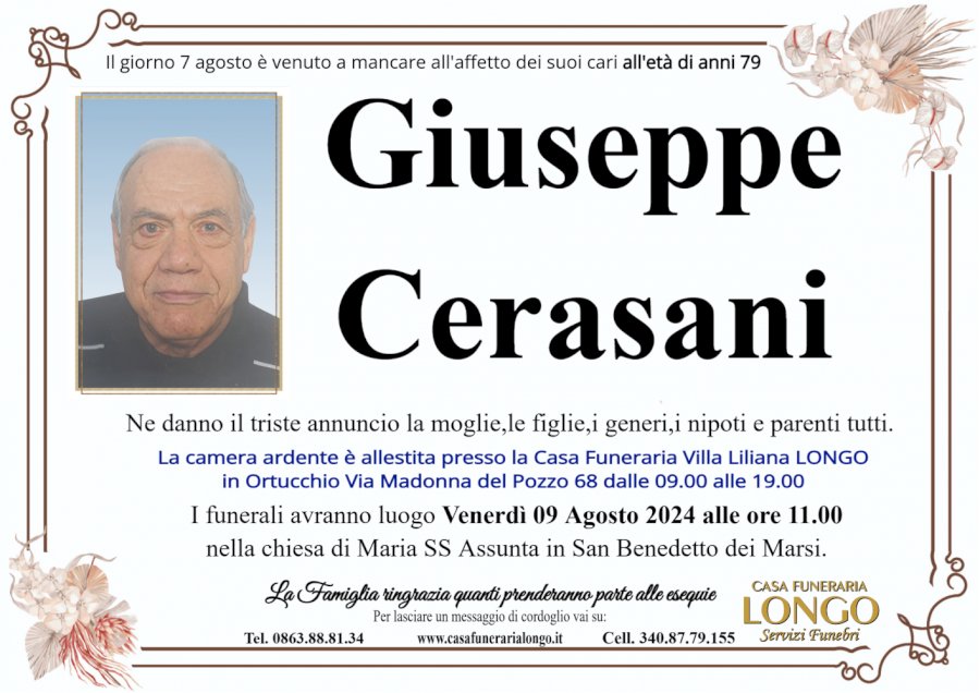 Il giorno 7 agosto è venuto a mancare all'affetto dei suoi cari all'età di anni 79 Giuseppe Cerasani. Ne danno il triste annuncio la moglie, le figlie, i generi, i nipoti e parenti tutti.