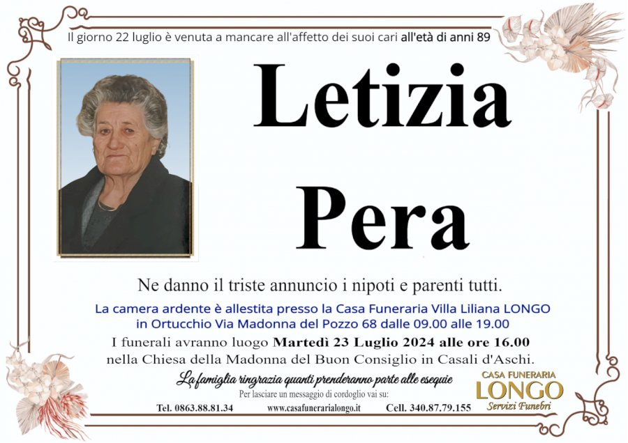 Il giorno 22 luglio è venuta a mancare all'affetto dei suoi cari all'età di anni 89 Letizia Pera. Ne danno il triste annuncio i nipoti e parenti tutti.