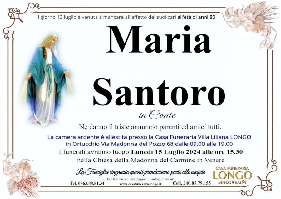 Il giorno 13 luglio è venuta a mancare all'affetto dei suoi cari all'età di anni 80 Maria Santoro in Conte Ne danno il triste annuncio parenti ed amici tutti. La camera ardente è allestita presso la Casa Funeraria Villa Liliana LONGO in Ortucchio Via Madonna del Pozzo 68 dalle 09.00 alle 19.00 I funerali avranno luogo Lunedì 15 Luglio 2024 alle ore 15.30 nella Chiesa della Madonna del Carmine in Venere La Famiglia ringrazia quanti prenderanno parte alle esequie Per lasciare un messaggio di cordoglio vai su: Tel. 0863.88.81.34 www.casafunerarialongo.it Cell. 340.87.79.155 CASA FUNERARIA LONGO Servizi Funebri