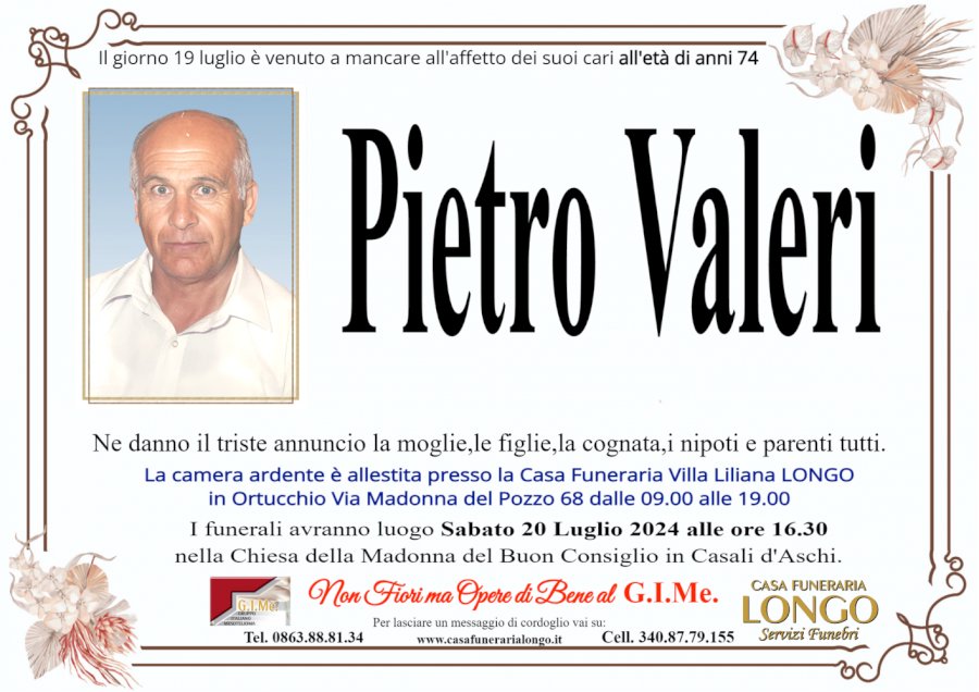Il giorno 19 luglio è venuto a mancare all'affetto dei suoi cari all'età di anni 74 Pietro Valeri Ne danno il triste annuncio la moglie,le figlie,la cognata,i nipoti e parenti tutti.
