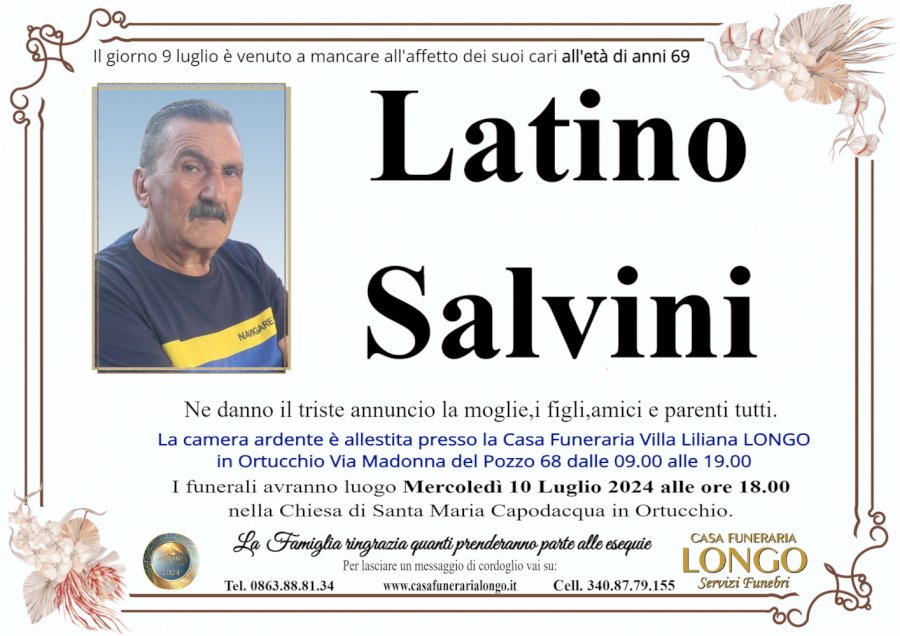 Il giorno 9 luglio è venuto a mancare all'affetto dei suoi cari all'età di anni 69 LatinonSalvininnNe danno il triste annuncio la moglie, i figli, amici e parenti tutti. La camera ardente è allestita presso la Casa Funeraria Villa Liliana LONGO in Ortucchio Via Madonna del Pozzo 68 dalle 09.00 alle 19.00 I funerali avranno luogo Mercoledì 10 Luglio 2024 alle ore 18.00 nella Chiesa di Santa Maria Capodacqua in Ortucchio. La Famiglia ringrazia quanti prenderanno parte alle esequiennPer lasciare un messaggio di cordoglio vai su: Tel. 0863.88.81.34 www.casafunerarialongo.it Cell. 340.87.79.155 CASA FUNERARIAnLONGOnServizi Funebri