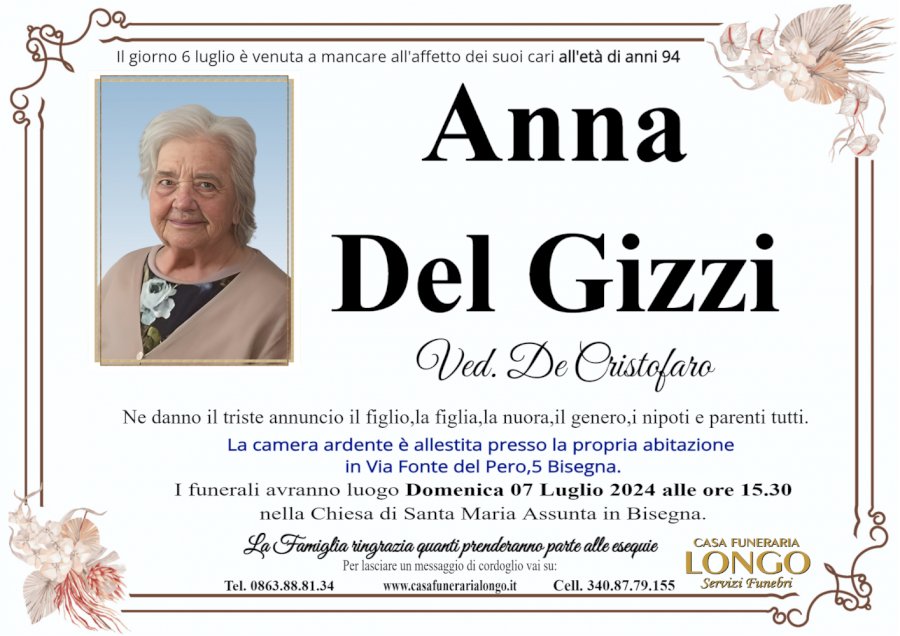 Il giorno 6 luglio è venuta a mancare all'affetto dei suoi cari all'età di anni 94 AnnanDel GizzinVed. De CristofaronnNe danno il triste annuncio il figlio,la figlia,la nuora,il genero,i nipoti e parenti tutti. La camera ardente è allestita presso la propria abitazionenin Via Fonte del Pero,5 Bisegna. I funerali avranno luogo Domenica 07 Luglio 2024 alle ore 15.30 ella Chiesa di Santa Maria Assunta in Bisegna. La Famiglia ringrazia quanti prenderanno parte alle esequiennPer lasciare un messaggio di cordoglio vai su: Tel. 0863.88.81.34 www.casafunerarialongo.it Cell. 340.87.79.155 CASA FUNERARIAnLONGOnServizi Funebri