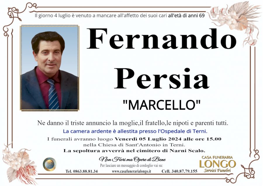 Il giorno 4 luglio è venuto a mancare all'affetto dei suoi cari all'età di anni 69 Fernando Persia "MARCELLO" Ne danno il triste annuncio la moglie, il fratello, le nipoti e parenti tutti. La camera ardente è allestita presso l'Ospedale di Terni. I funerali avranno luogo Venerdì 05 Luglio 2024 alle ore 15.00 nella Chiesa di Sant'Antonio in Terni. La sepoltura avverrà nel cimitero di Narni Scalo. Non Fiori ma Opere di Bene Per lasciare un messaggio di cordoglio vai su: Tel. 0863.88.81.34 www.casafunerarialongo.it Cell. 340.87.79.155 CASA FUNERARIA LONGO Servizi Funebri