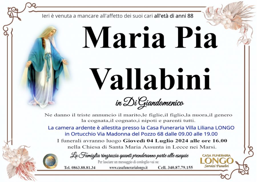 Ieri è venuta a mancare all'affetto dei suoi cari all'età di anni 88 Maria Pia Vallabini in Di Giandomenico. Ne danno il triste annuncio il marito, le figlie, il figlio, la nuora, il genero la cognata, il cognato, i nipoti e parenti tutti. La camera ardente è allestita presso la Casa Funeraria Villa Liliana LONGO in Ortucchio Via Madonna del Pozzo 68 dalle 09.00 alle 19.00. I funerali avranno luogo Giovedì 04 Luglio 2024 alle ore 16.00 nella Chiesa di Santa Maria Assunta in Lecce nei Marsi. La Famiglia ringrazia quanti prenderanno parte alle esequie.