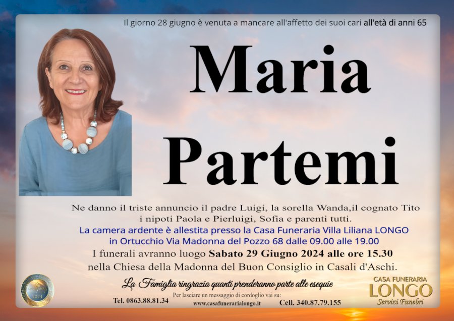 Il giorno 28 giugno è venuta a mancare all'affetto dei suoi cari all'età di anni 65 Maria Partemi. Ne danno il triste annuncio il padre Luigi, la sorella Wanda, il cognato Tito i nipoti Paola e Pierluigi, Sofia e parenti tutti.